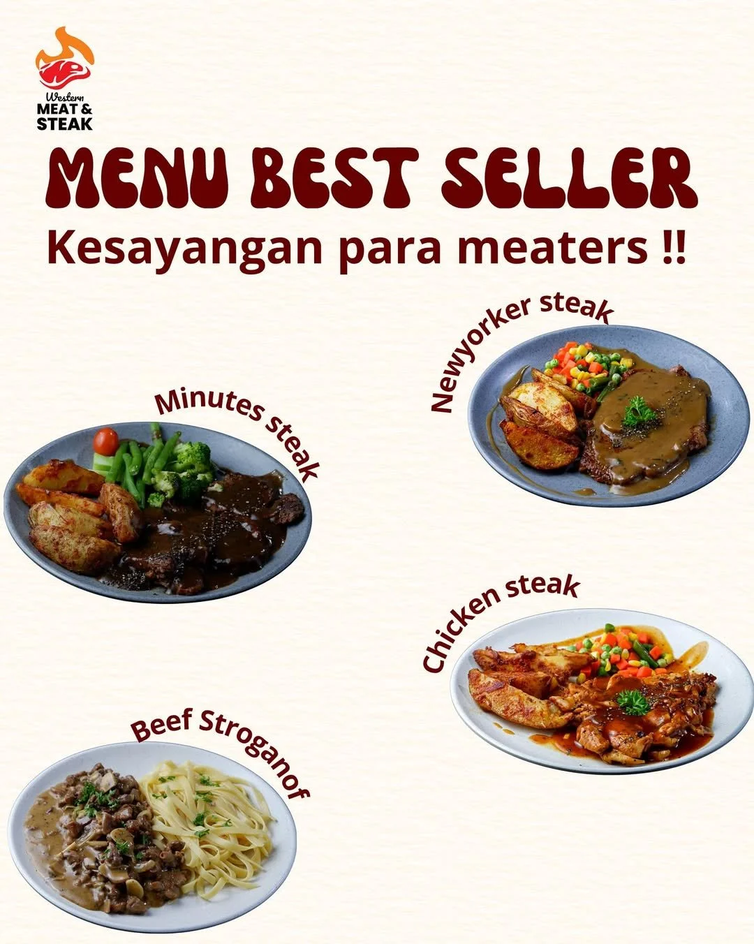 Menu andalan dari Franchise Western Meat & Steak mencakup berbagai varian seperti sirloin steak, chicken steak, burger steak, hingga beef bowl yang kekinian. Salah satu yang paling populer adalah “Sirloin Pepper Steak” atau “Minutes Steak” yang disajikan dengan saus khas dan kentang goreng renyah.